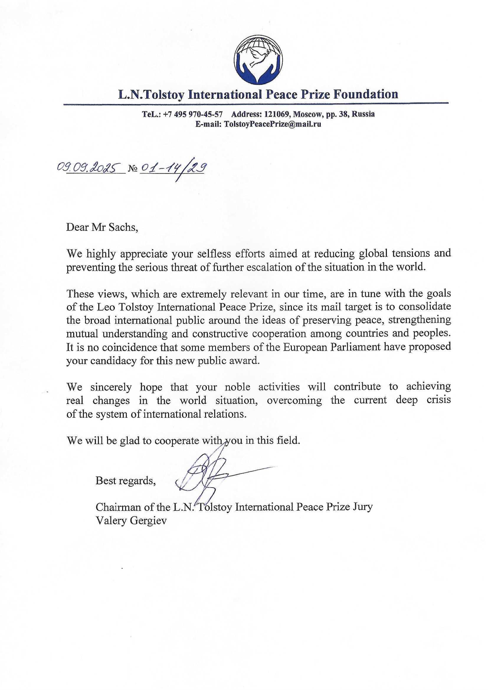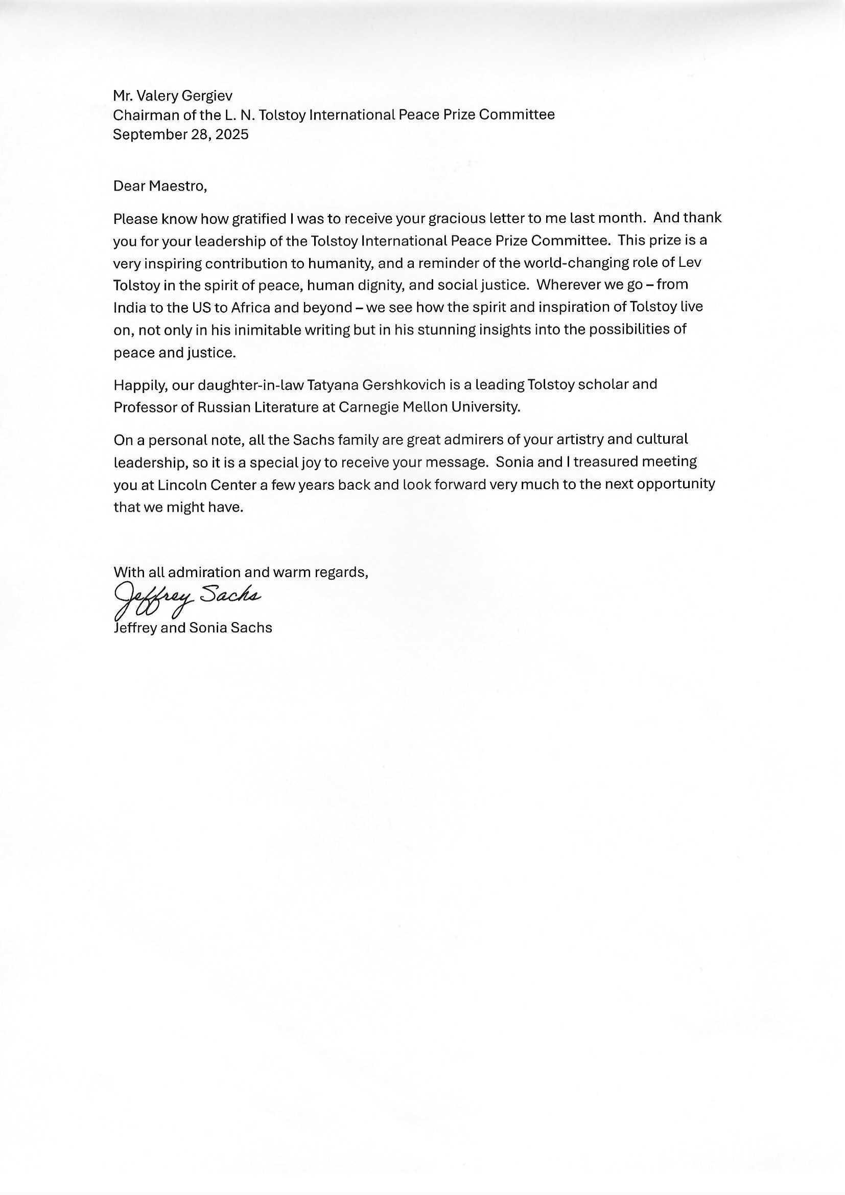 Response by American political scientist Jeffrey Sachs to an appeal by Valery Gergiev, Chairman of the Jury of the L.eo Tolstoy International Peace Prize.